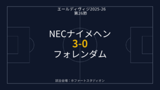 エールディヴィジ2025-26第26節「NECナイメヘン vs フォレンダム」は3-0でNECが快勝。佐野航大は先発出場で中盤を支え、小川航基はベンチ入り。試合の流れと日本人選手の状況を整理します。